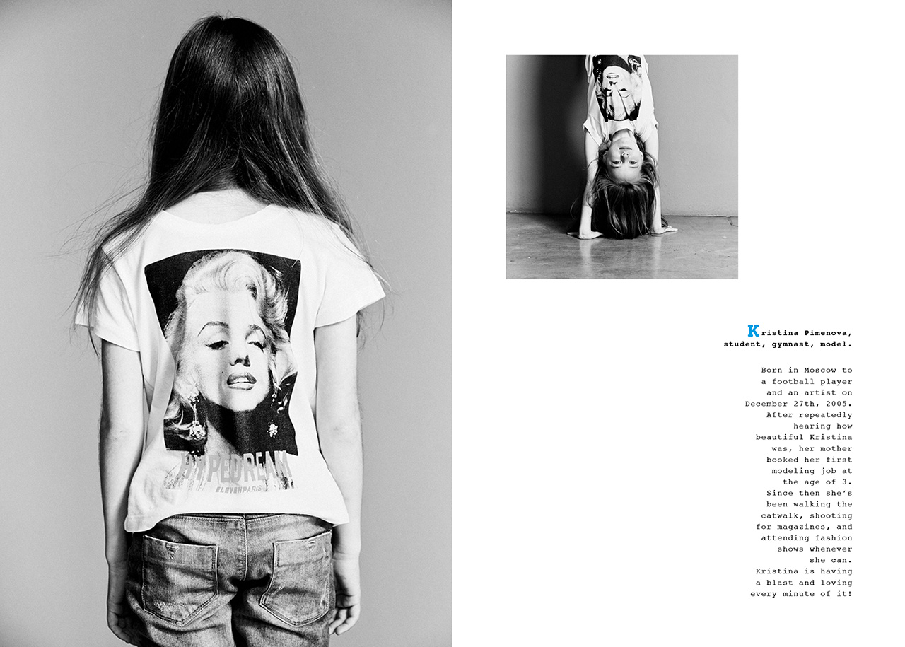 Kristina Pimenova, student, gymnast, model. Born in Moscow to a football player and an artist on December 27th, 2005. After repeatedly hearing how beautiful Kristina was, her mother booked her first